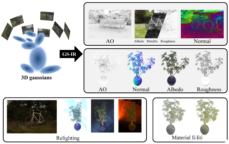 By disassembling the materials and lighting components, GS-IR technology allows for appearance alteration by supporting relighting operations and enabling material-level modifications.