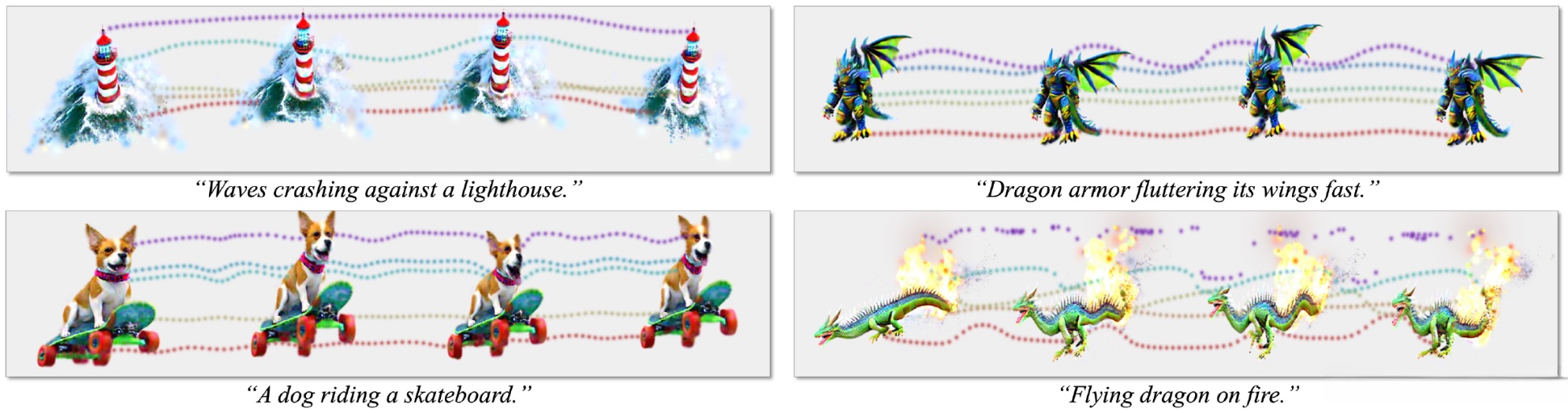 The outputs of the four-dimensional data generation process for AYG [264] reveal diverse four-dimensional motion sequences. These sequences are visualized using dotted lines to depict the deformation dynamics of the transformation field.