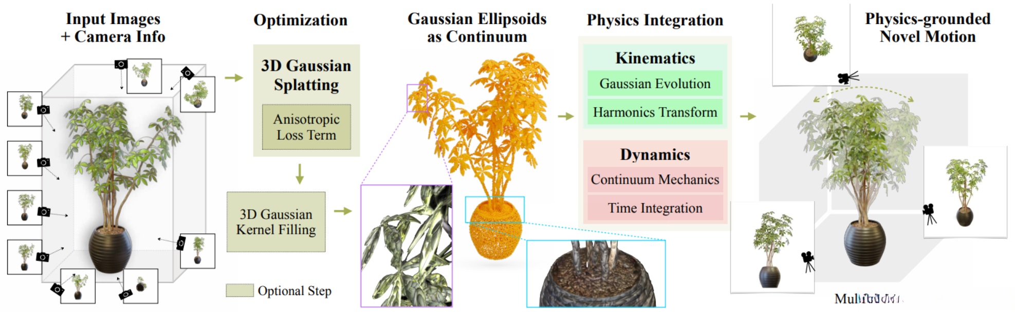 Processing pipeline for PhysGaussian. Handling 3D Gaussian distributions as a continuum, the software is capable of generating physically accurate simulation outcomes.