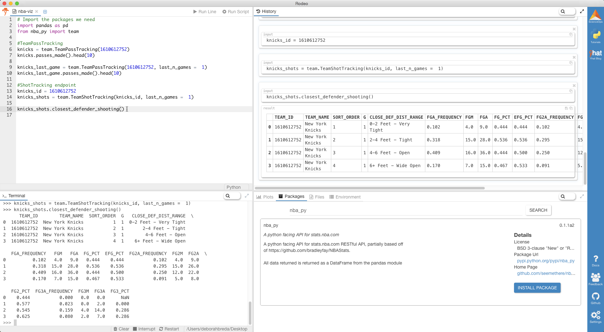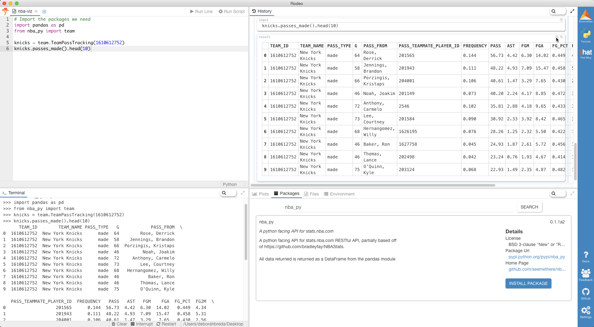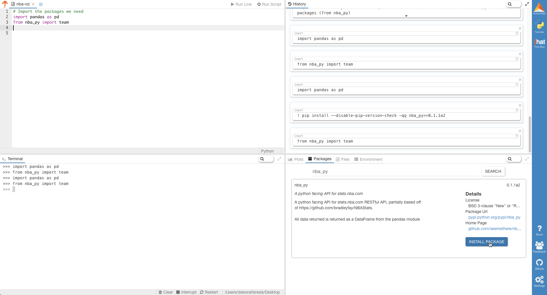 如果您使用的是Yhat的Python IDE Rodeo ,则可以在“软件包”标签中安装nba_py 。