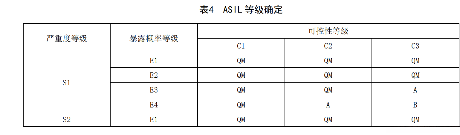每个危害事件的ASIL等级可依据"严重度"、"暴露概率"和"可控性"三个指标以及表4的数据来确定。