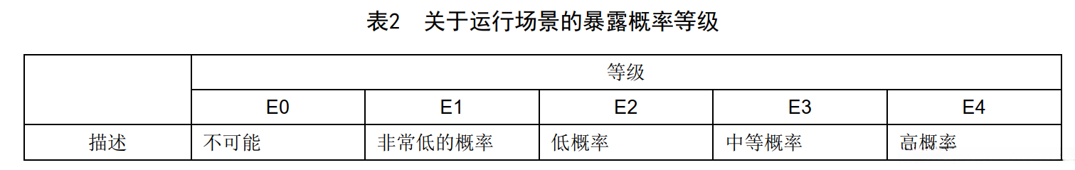 对于每一个危害事件, 应基于确定的理由预估各个运行场景的暴露概率. 按照表 2 规定, 在暴露概率上指定相应的E0至E4等级.