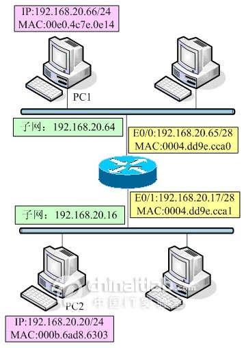 其中一个应用领域是,在这种情况下(如图5所示),主机PC1(IP地址192.168.20.66/24)试图发送报文给同一主网络内的目标主机PC2(IP地址192.168.20.20/24)。由于PC1缺乏子网信息且与目标主机位于同一主网络中,在发送ARP请求广播报文请求目标MAC地址时会遇到障碍。这时路由器会识别出目标地址属于其他子网(需注意的是:路由器的接口IP配置为28位掩码),并将其回复为自己的硬件地址(如00:04:dd:9e:cc:a0)。随后PC1将向PC2发送的数据包都发往MAC地址00:04:dd:9e:cc:a0(对应于路由器通过其E0/0接口传出的数据包)。路由器则会将这些数据包转发至目标主机PC2。(接下来,在完成对PC2角色的设置后,路由器会继续执行相同的操作以实现数据包传递功能)。这种机制使得子网化网络架构对于各主机而言显得完全透明。(即通过模拟真实MAC地址的行为来完成间接通信)。