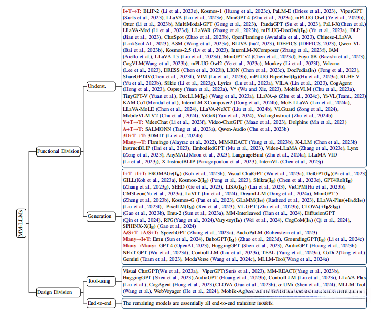 图3 MM-LLM的分类。I:图像,V:视频,A/S:音频/语音,T:文本。ID:文档理解,IB:输出框边界,IM:输出分割掩模,IR:输出检索图像。