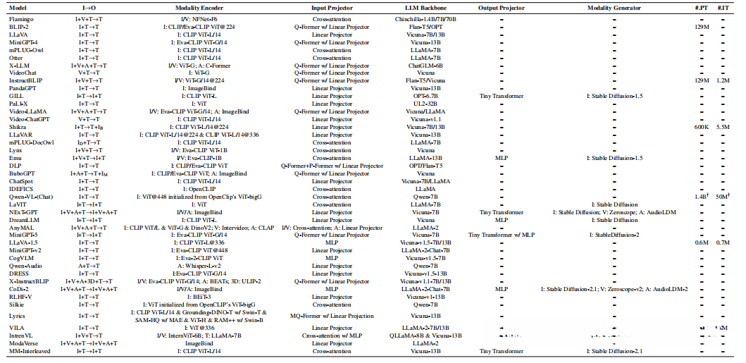 表1 43个主流MM-LLM的总结。I→O:输入到输出模态,I:图像,V:视频,A:音频,3D:点云,T:文本。在 Modality Encoder 中,“-L”表示 Large,“-G”表示 Giant,“/14”表示 patch 大小为 14,“@224”表示图像分辨率为 224 × 224。#.PT 和 #.IT 分别表示 MM PT 和 MM IT 期间数据集的规模。† 包括不可公开访问的内部数据。
