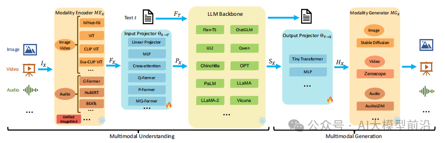 图2 MM-LLMs的一般模型架构以及每个组件的实现选择。