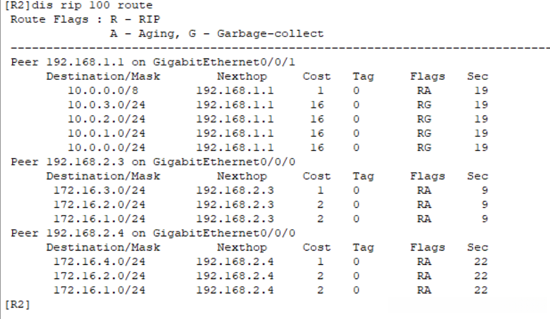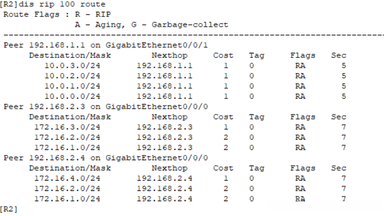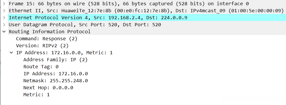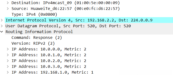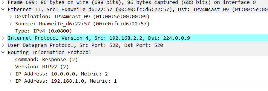 操作完成后的R2路由表项和收到的RIP报文入下图,可以看到其他明细路由项已经不可达,收到的RIP报文中只有聚合后的路由表项
