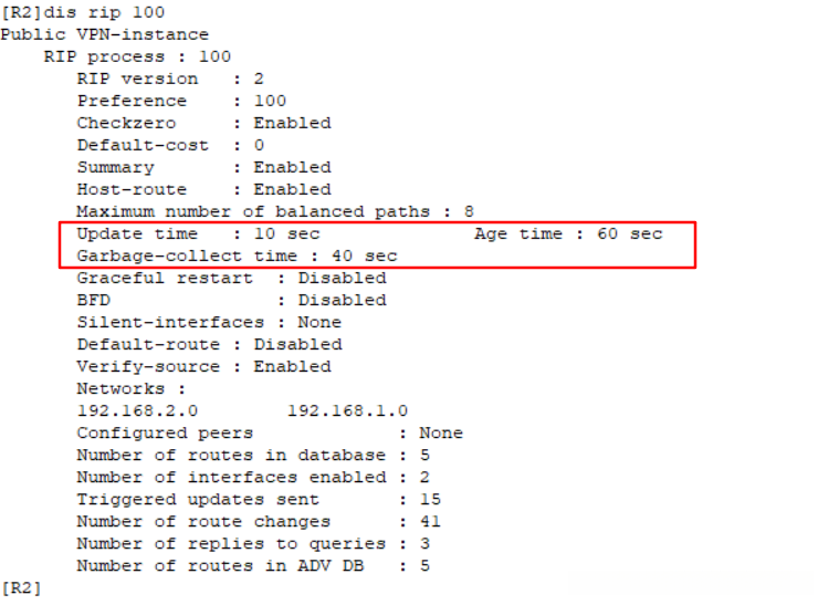 timers rip update age garbage-collect,RIP视图命令,用来调整定时器,update为更新报文发送间隔,age为路由老化时间,garbage-collect为garbage收集时间;