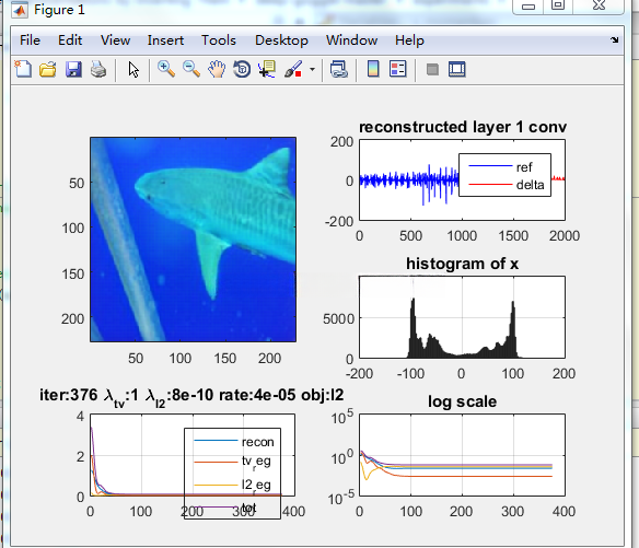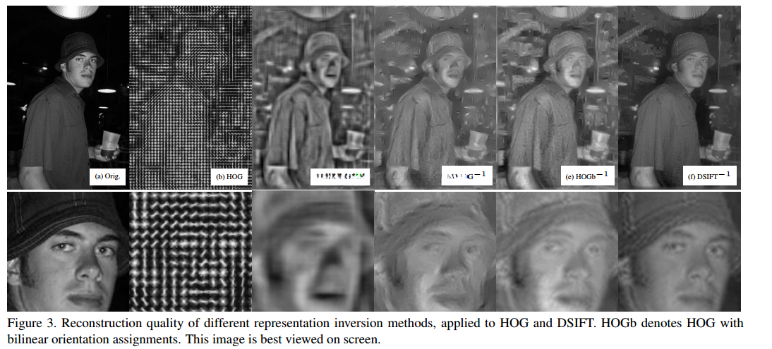 通过目标函数梯度迭代,更新随机输入x,使输入x与原图像im相差最小。这过程中,模型net的weight是不变的,in other words,通过与hog、dsift的浅层表达对比,可以得出cnn模型学习到feature更好。(由某层feature map的差,invert 得到原表达的)