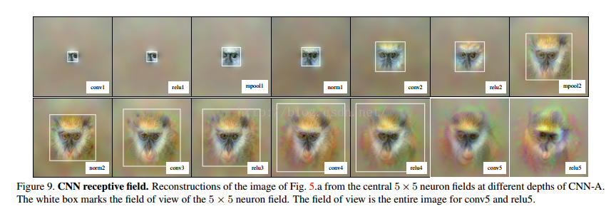 CNN的接收域,从每层的feature中选取小patch进行invert,得到的图。接收域比理论区域明显要小。
