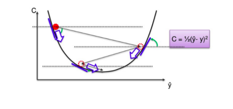 只要实际值和预测值之间存在差异,我们就需要调整这些权重。一旦我们稍微调整它们并再次运行神经网络,就会产生一个新的成本函数,希望比上一个更小。