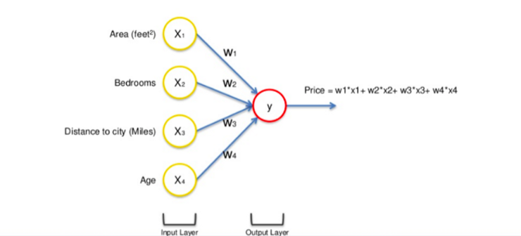 让我们以第一个神经元的面积和到城市的距离为非零为例,这意味着它们是加权的并且对第一个神经元很重要。另外两个变量“卧室”和“年龄”没有加权,因此第一个神经元不考虑这些变量。