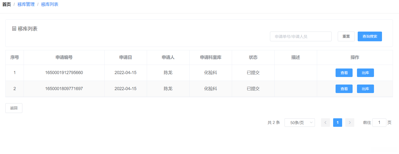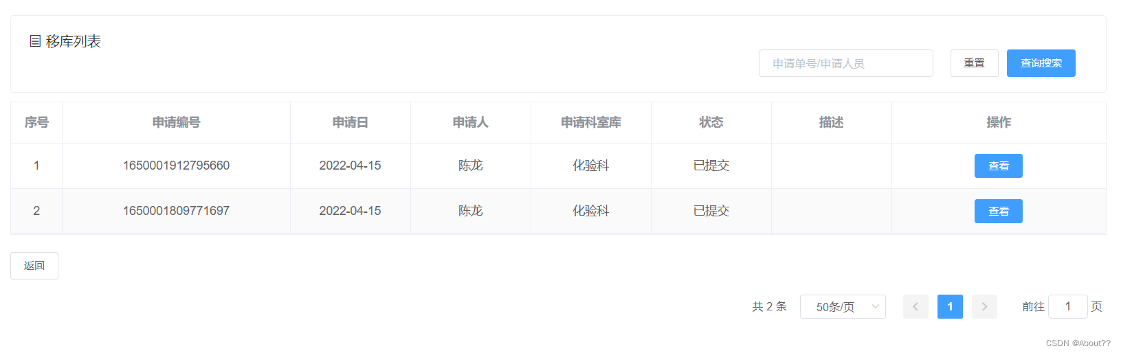 科室库和中心库都有查看申请的列表的功能(当科室库需要某种耗材的时候要向中心库提交申请)中心库还有对申请表进行确认的功能但科室库没有。