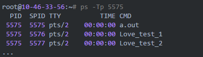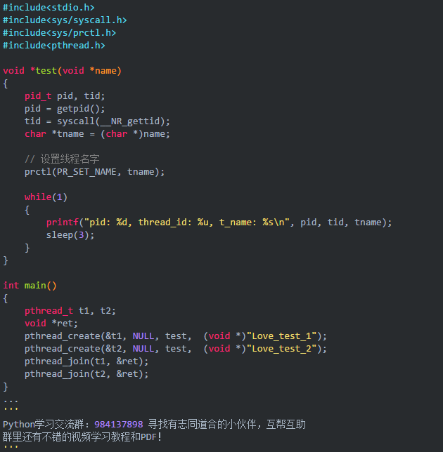 代码看起来有点长,但是逻辑相当简单,Thread-test1和Thread-test2都是打印出当前的 pid、线程 id 和 线程名字,然后 3s 后退出,这个是想模拟线程正常退出。