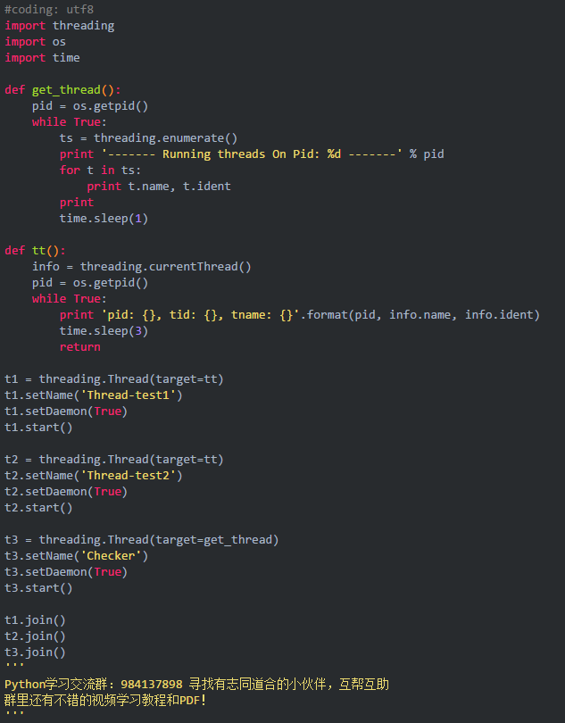 可以明显看到一开始是可以看到Thread-test1和Thread-test2的信息,当它俩退出之后就只剩下MainThread和Checker自身而已了。
