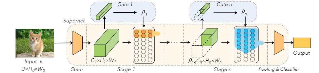 如图所示, DS-Net主要由超级网络(Supernet)和若干动态门构成,其中超级网络负责实现系统的主要功能,而这些动态门则是一组具有预测功能的模块.在超级网络的不同阶段,这些动态门将根据当前状态将输入路由至不同宽度的子网中.