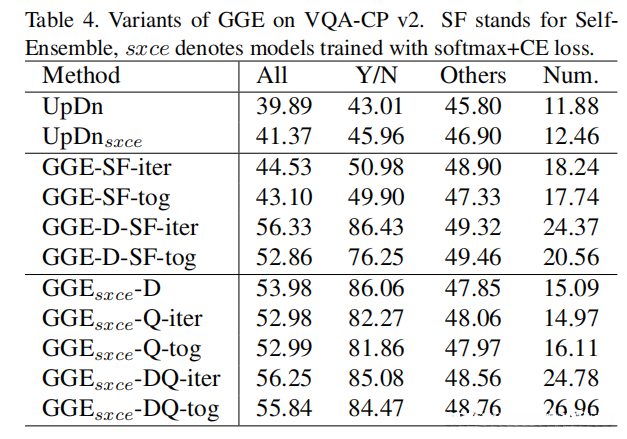 GGE的表现很大程度取决于预训练的偏见特征,此特征需要任务或数据集的先验知识。为进一步讨论GGE的泛化,我们测试一个更灵活的自我集成GGE-SF。GGE-SF将共同表示作为偏见特征,而不是预训练的只有问题分支,偏见预测为: