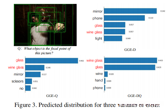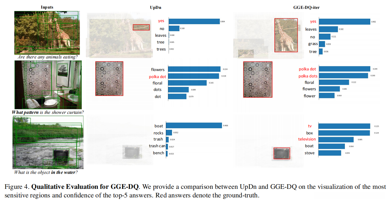 图4表示GGE-DQ如何利用视觉信息进行推理,我们提供了三种UpDn失败的例子,第一个关于shortcut偏见,UpDn的预测并没有基于正确的视觉接地;第二个例子关于分布偏见,UpDn正确的捕捉了视觉区域但仍然依据分布偏见回答问题;最后一个例子是除了y/n之外,减少语言先验的情况,UpDn只基于语言上下文in the water回答了boat,然而GGE-DQ提供了正确的回答tv和television,且有更显著的视觉区域。这些例子定性的验证了预测的准确率和视觉解释两方面的提升。