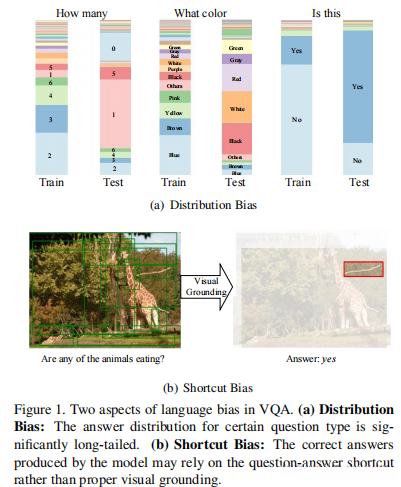 通过实验分析,语言偏见实际上为两种:a)训练和测试间的统计分布差距,b)特定QA对的语义相关性,如图1所示。
