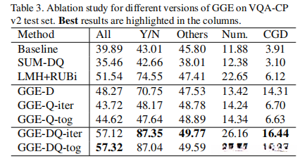 第一组消融是验证贪婪集成是否能保证用偏见模型学习偏见数据。我们比较其他两种集成策略,SUM-DQ直接总结偏见模型和基本模型的输出,LMH+RUBi结合LMH的分布偏见和RUBi的shortcut偏见。表5所示,SUM-DQ甚至比基线更糟,同时LMH+RUBi的正确率与LMH类似,大约比GGE-DQ糟6%,表示GGE可以真正迫使有偏见的数据被序列化的有偏见模型学习。基于分布或shortcut偏差容易预测的实例将被相应的偏见模型很好地拟合。因此,基础模型必须更加关注困难的例子,并考虑更多的视觉信息来进行最终决策。
