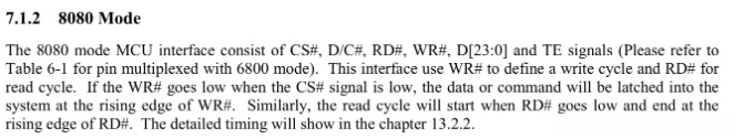如下图所示,LCD采用8080接口,CS片选,D/C命令/数据切换,RD读操作,WR写操作,D[23:0]数据总线