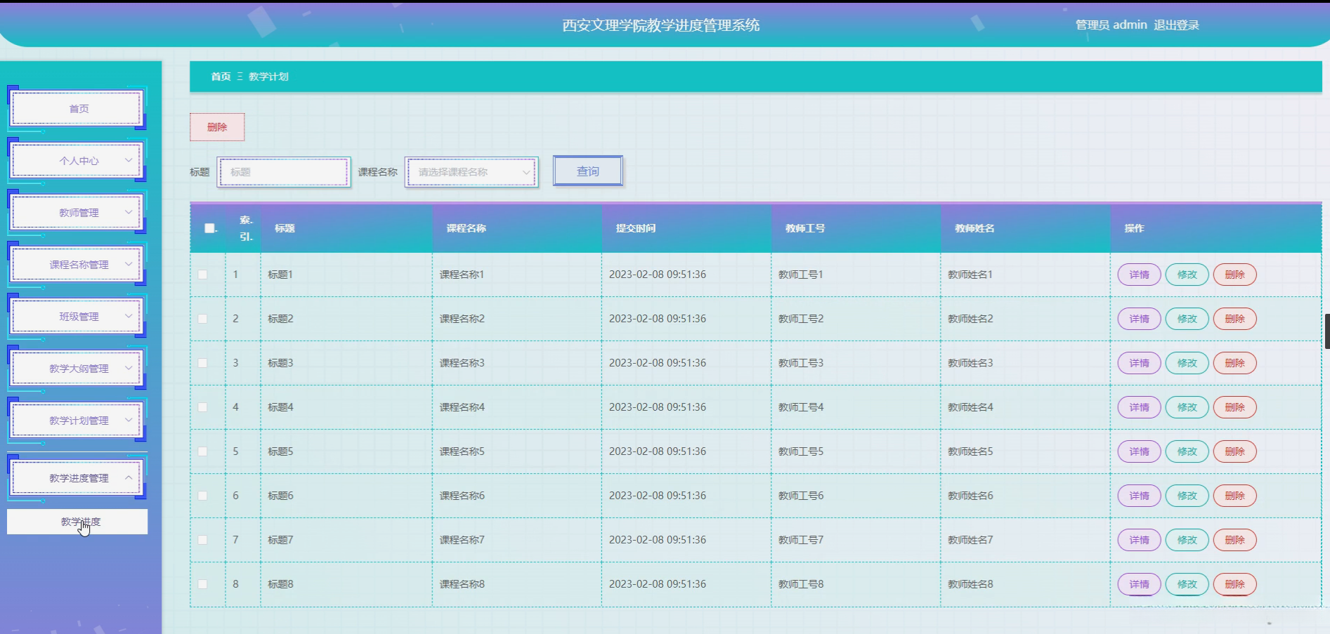 在教育信息化不断发展推进的过程中,在高校 teaching 管理工作中面临着前所未有的挑战与机遇。西安文理学院作为一所致力于培养高素质应用型人才的高等学府,在其教学管理工作中面临着日益复杂的挑战和更高的管理要求。传统的教学进度管理方式主要依赖于纸质文档和人工统计手段,在提升效率的同时也难以实现对教学动态的有效追踪,并因而影响到教学资源的合理配置和教学质量的整体把控。基于此,在当前高等教育快速发展的背景下,在 such 教学管理模式下构建出能够适应现代 teaching 管理需求的教学进度管理系统成为提升西安文理学院 teaching 管理水平的关键举措。