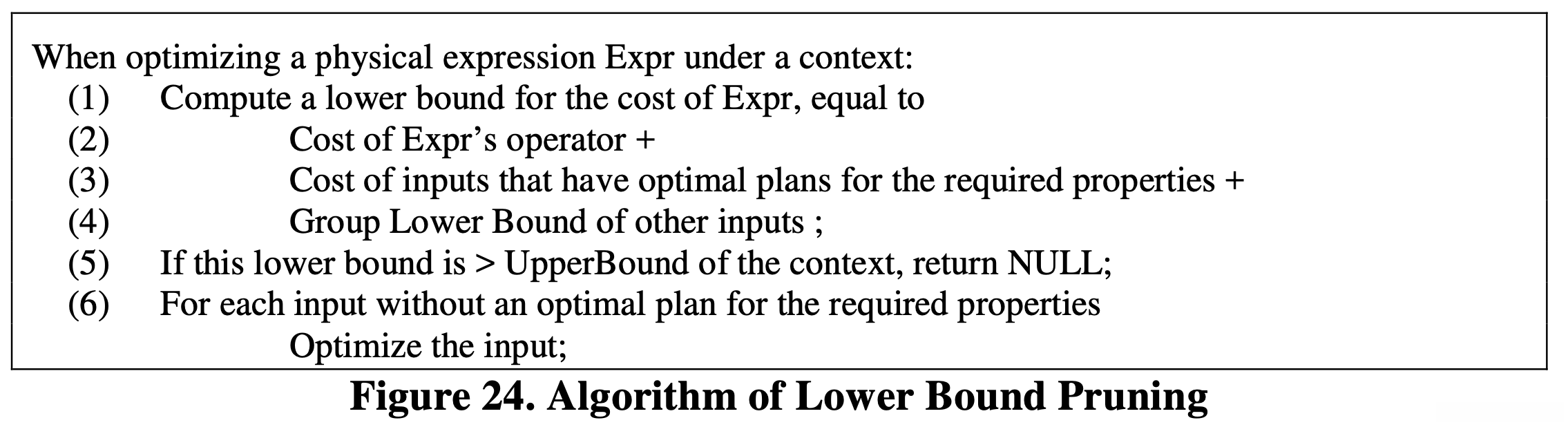 动机: 该类Top-down优化器通过预估high-level物理计划(Physical plans)之前的low-level计划(Lower-level plans)的成本(Costs),从而为后续的任务提供参考数据。这些预估的成本将被用作后续子优化任务中的上限(Upper bounds),从而有助于减少不必要的计算。在实际应用中,这种上界机制通常有助于减少对所有可能表达式组合(Expressions group)的需求,并被称为剪枝(Pruning)。