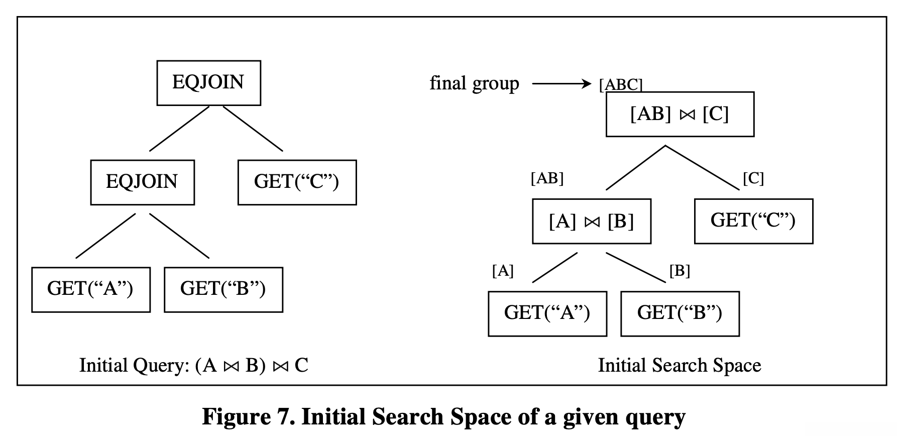 在数据库系统中,search space被定义为一个逻辑查询树(logical query structure)与物理计划(physical plans)之间的空间概念。为了优化资源利用效率,该空间采用分组(groups)体系进行组织管理:每个分组(group)负责接收其他分组(groups)作为输入,并在计算过程中进行数据整合处理。特别地,在整个计算流程中会被指定为最终group(final group),其作用就是反映初始查询(initial query)的最终评估结果。为了直观展示这一计算过程,在图中给出了初始搜索空间(initial search space)的具体分布情况
