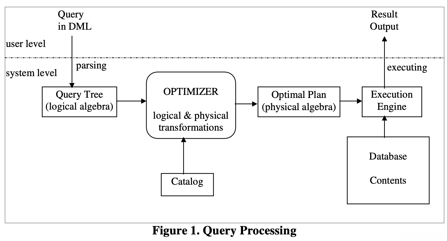 上图通过流程图的形式展示了查询处理过程中的关键步骤。DML语法中的原始查询被解析为由逻辑代数元素构建的逻辑表达式树结构,在后续计算阶段能够相对容易地被处理。该内部逻辑形式会被传递给专门负责优化查询的系统单元,并在那里将被实现的两种主要类型转换方案包括:第一种方案旨在提高查询执行效率;第二种则专注于减少资源占用。