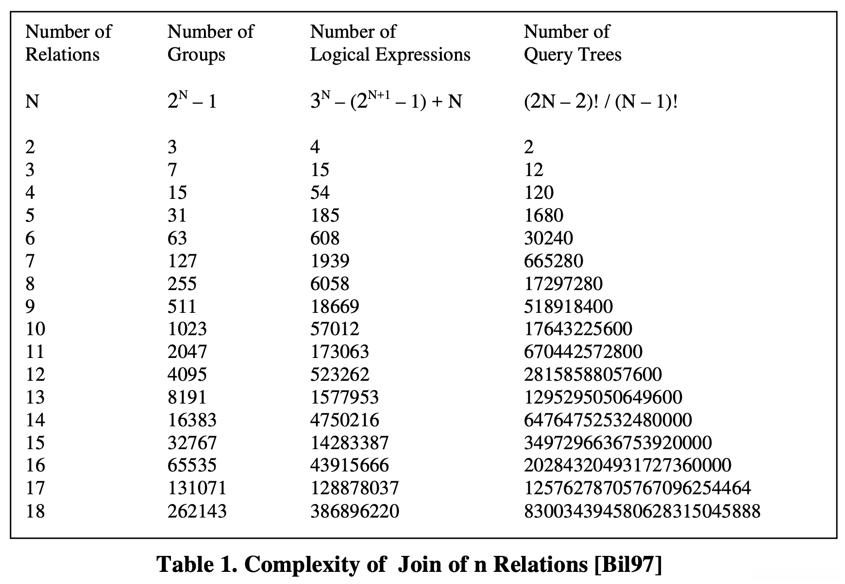 但潜在query tree的数量会随着执行计划节点的增长呈指数级增长。下表展示了具有n个relation的一个具有完全逻辑搜索空间且仅考虑logical expressions复杂度的情况。假设在search space中有N个loigcal expressions,并且该数据库系统中存在M个join algorithms,则最终搜索空间将包含M×N physical expressions.