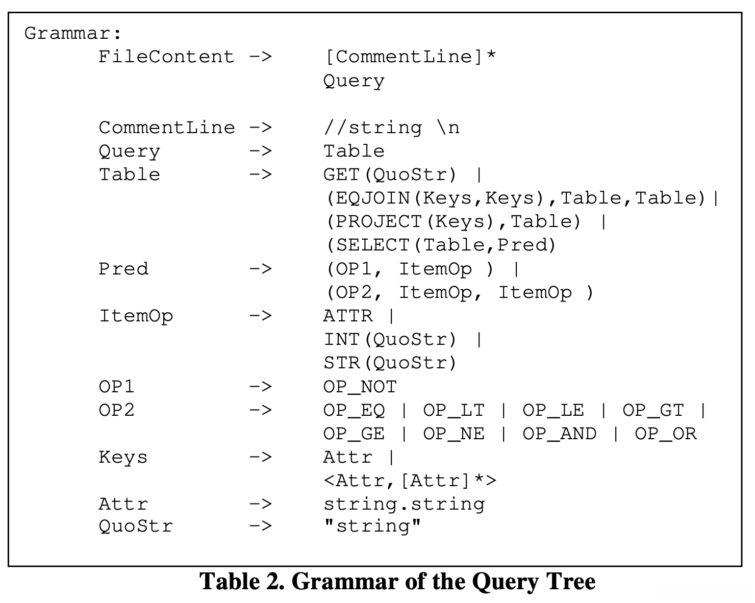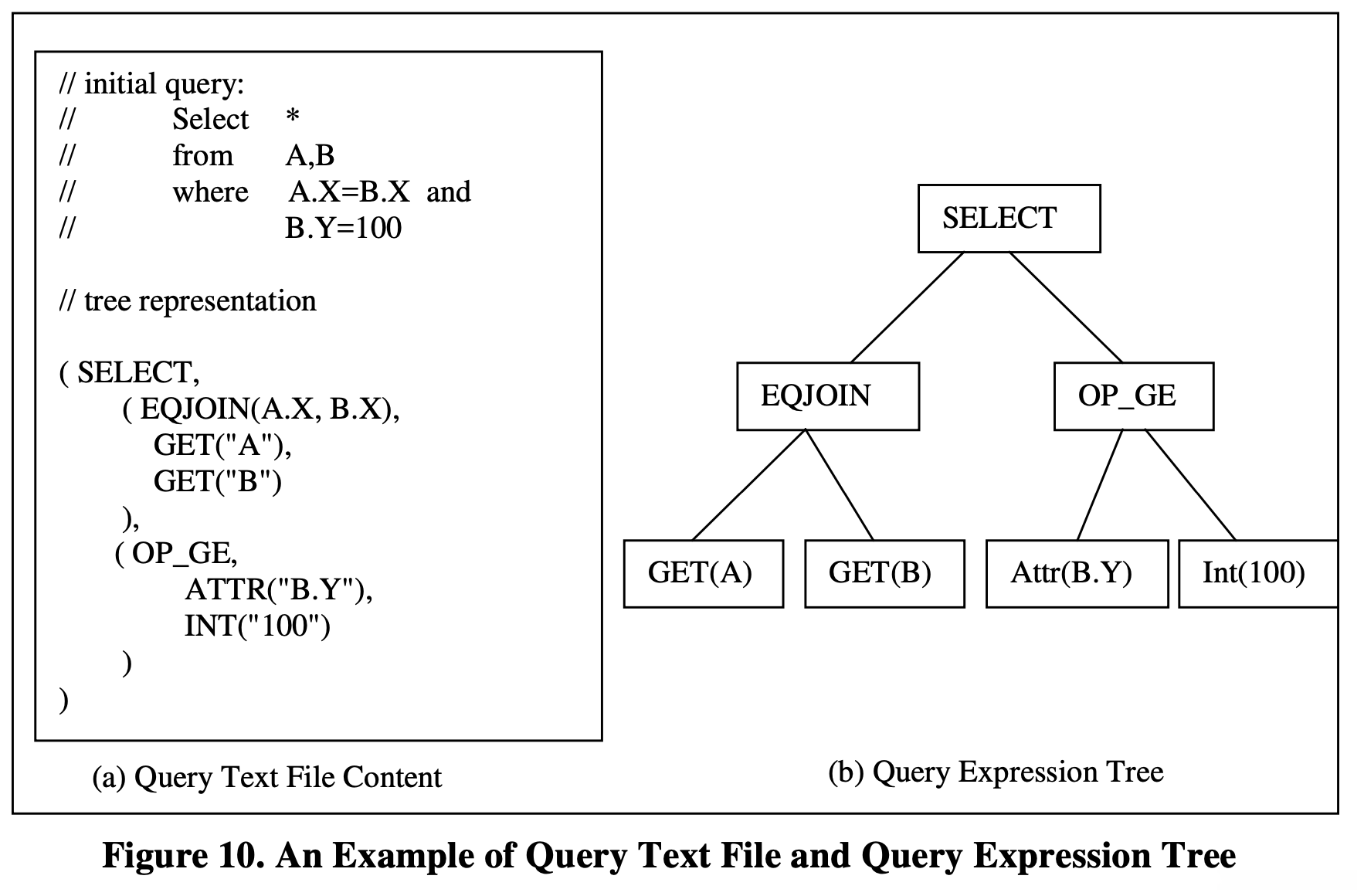 主要涉及的是逻辑运算符的是GET和EQJOIN这两个概念。每个GET操作符都没有输入,并且只有一个参数即是存储该relation所需的名称。该操作符会从磁盘上检索出该relation的所有记录,并将这些记录传递给后续的操作。每个EQJOIN操作符有两个输入,并且有一个额外的参数——这是一组用于定义连接条件的关系式集合。