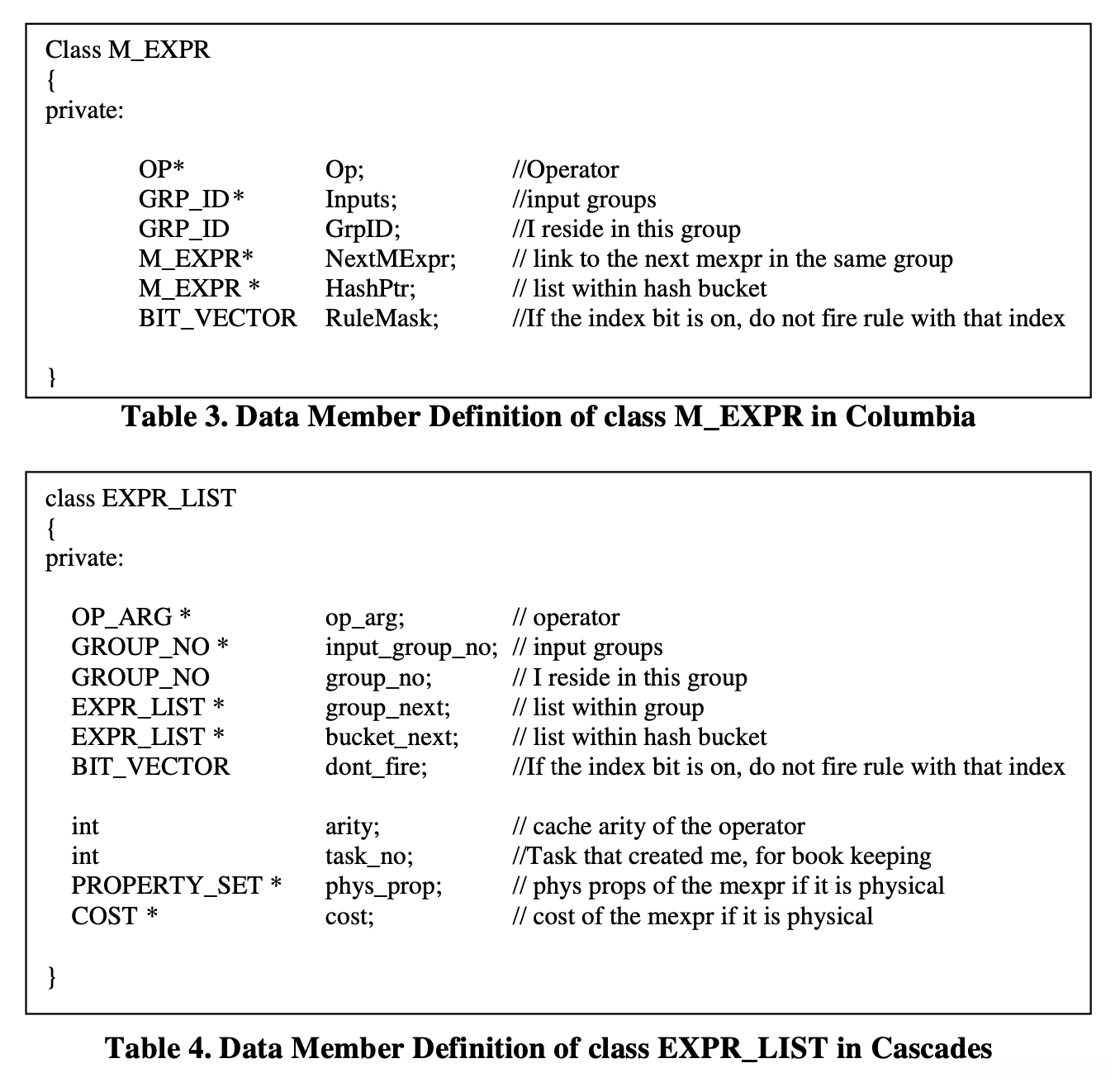 在优化多表达式的过程中,在算法设计方面 Columbia 和 Cascades 之间并无明显差别。然而,在技术细节上存在差异:Columbia 采用了一种称为 O_EXPR 的方法来进行进一步探索;而 Cascades 则引入了研究 E_EXPR 的新任务作为其核心创新点。