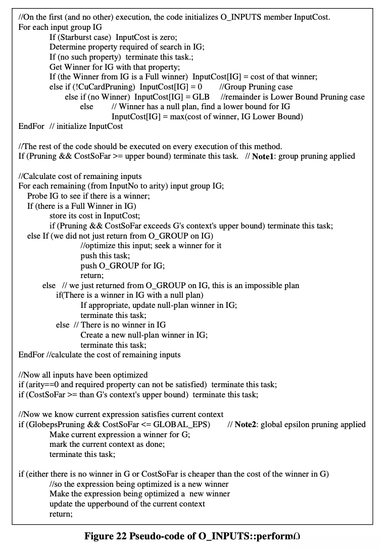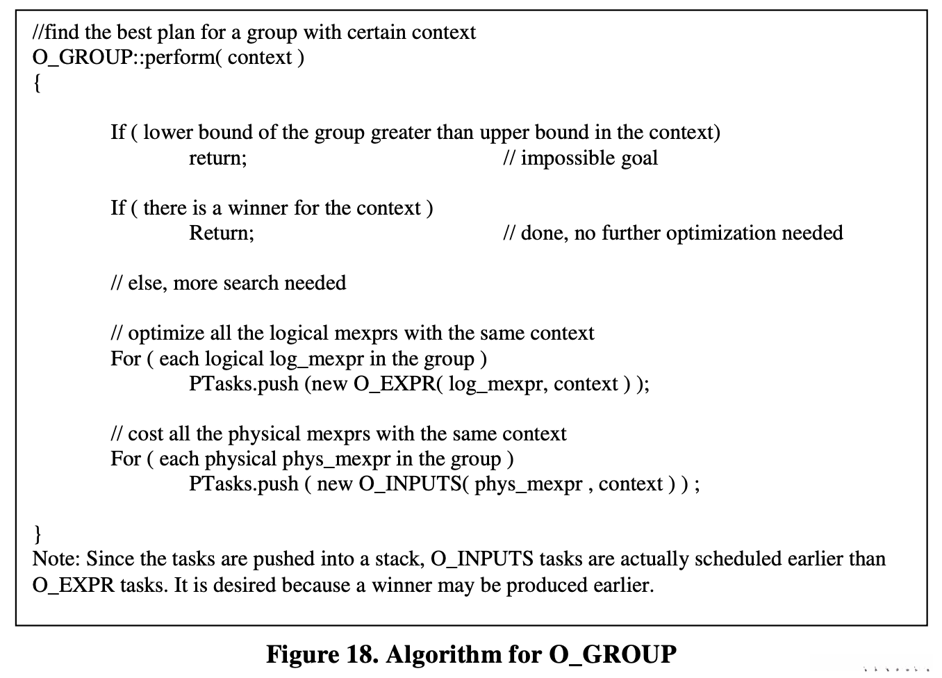 算法: 在这一章节中我们将具体说明Columbia所采用的改进型优化方案以提高group剪枝的成功率。如图所示 这个算法属于O_INPUTS任务的部分 并且是Figure22 Note1的具体阐述