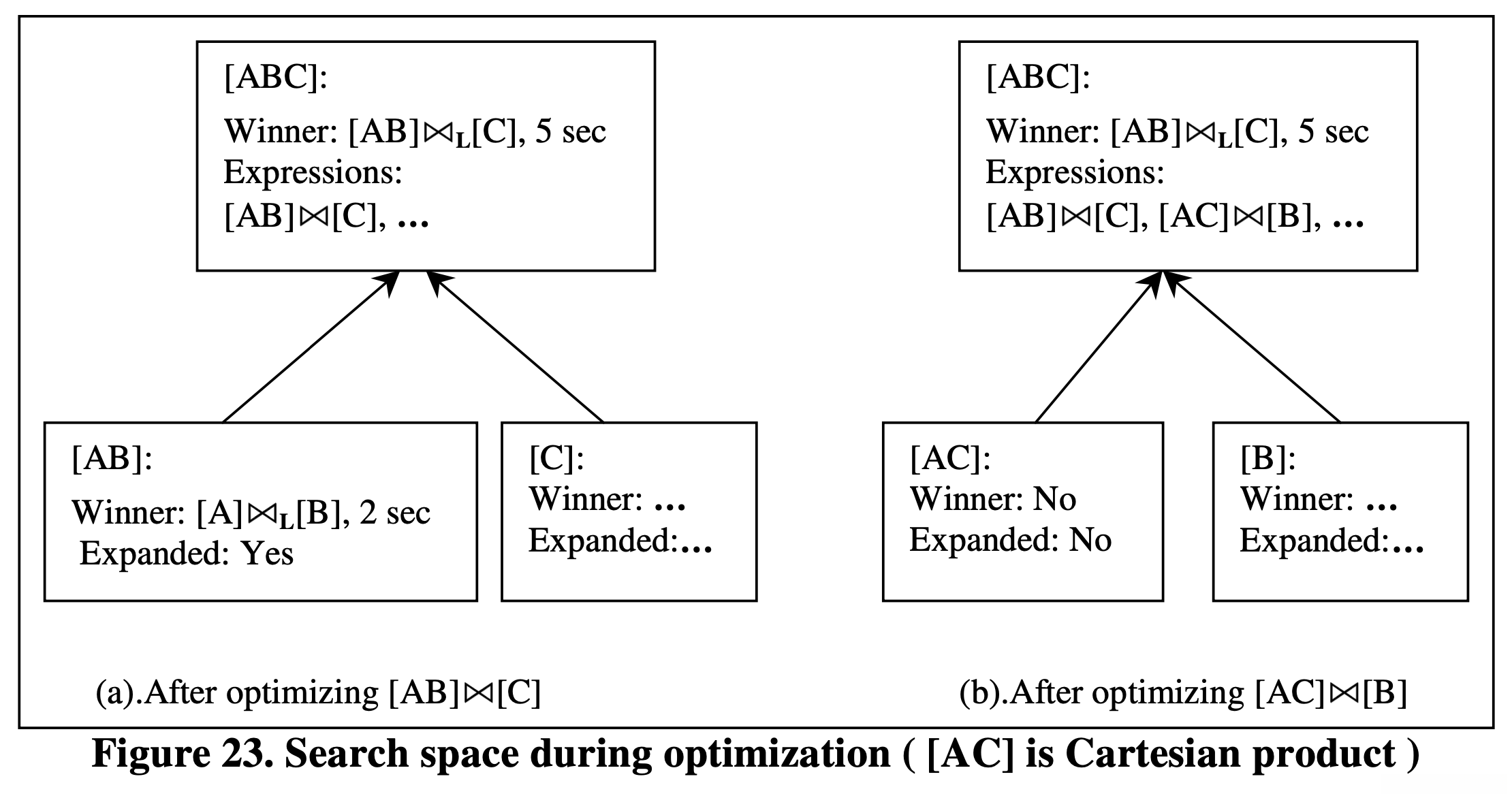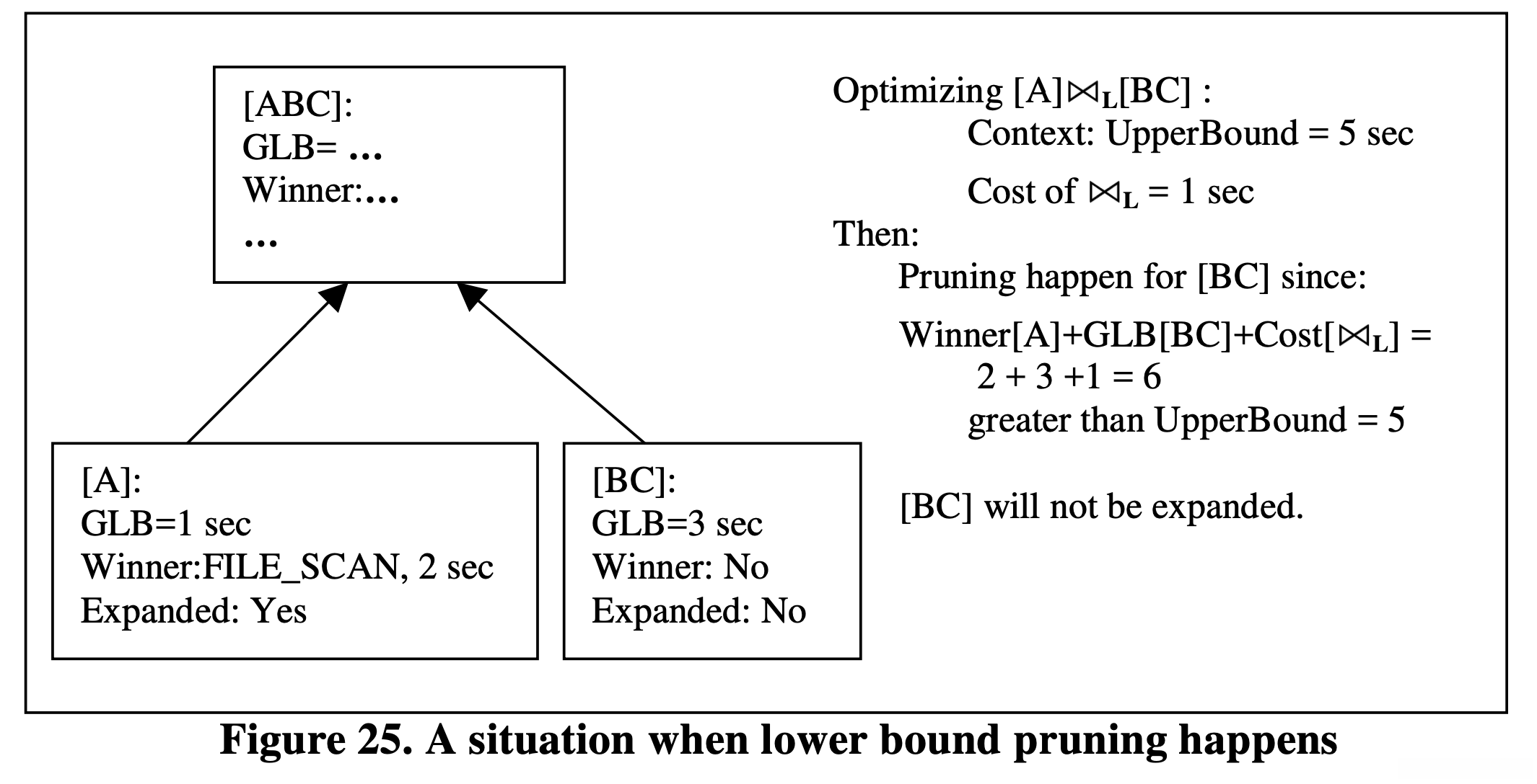 基于Columbia搜索过程的特点——自顶向下且具有记忆性——我们可以应用bounds来进行全局剪枝操作。例如,在优化器处理输入(A x B) x C时, 该系统会首先评估由三个组件共同组成的复合组别中的单个计划, 其成本计算为5秒(即(A x LB) x LC)。随后, 系统会在扩展相关组件时跳过其他组合的可能性, 如(AC)与(B)等组合. 现在, 我们进一步探讨如何针对其他表达式进行优化处理, 比如说(AC)x(B). 假设(AC)表示笛卡尔积运算, 由于其规模庞大, 将其移动到(ABC)中会导致耗时超过5秒. 因此包含(AC)的所有计划都不可能是(ABC)的最佳方案. 在这种情况下, 该系统就不会生成所有(AC)相关的计划. 另一方面, Starburst和其他bottom-up优化器在开始处理(ABC)之前就已经对各个子组件进行了优化工作, 因此错过了多个计划同时被剪枝的机会.