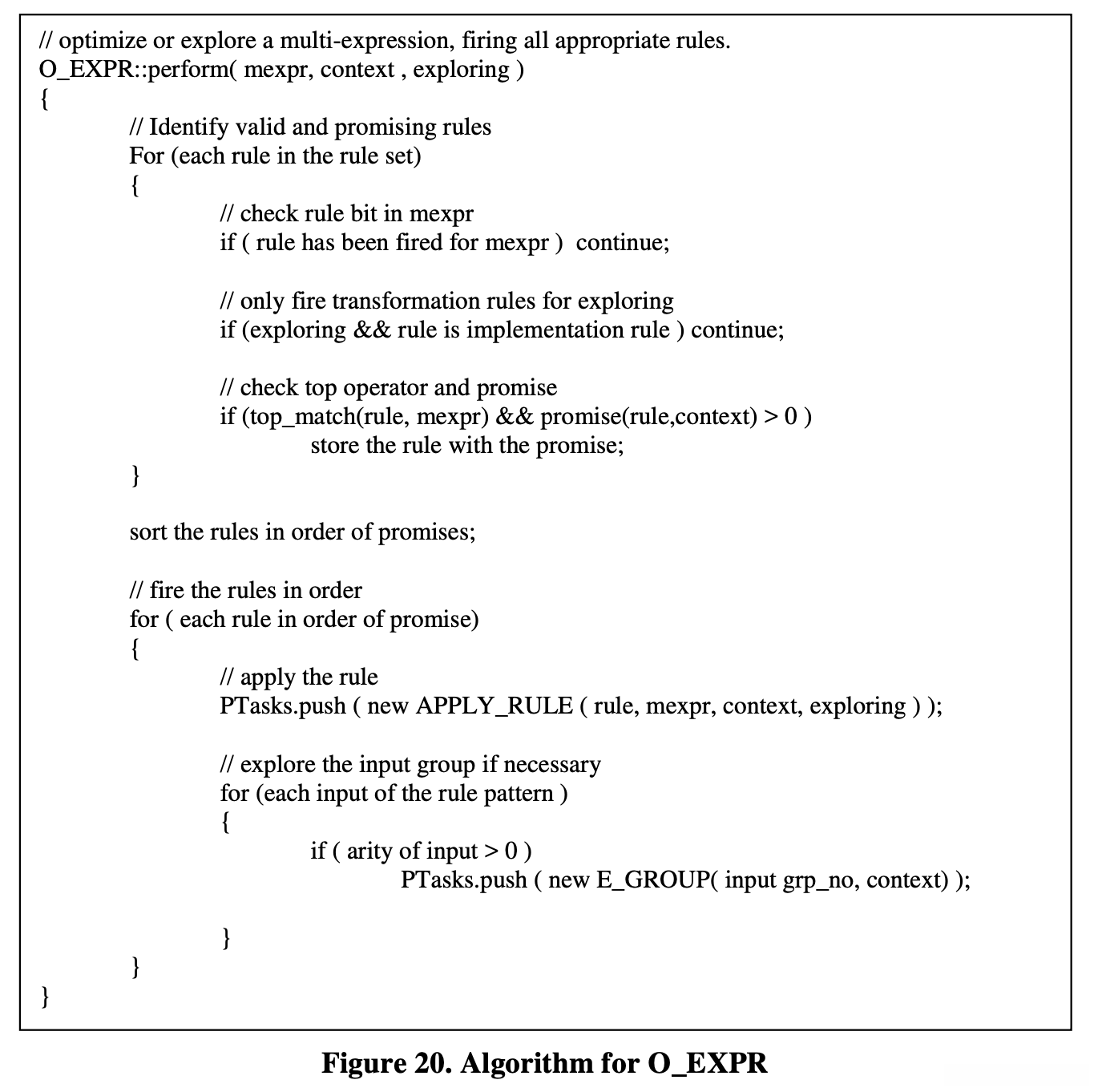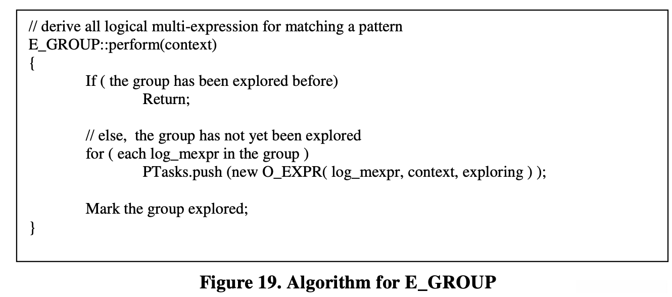 动态规划也常用来消除重复计算。在开始探索一个group的所有expressions之前,请注意该系统会检查当前group是否已经被探索过。如果是,则该系统将在不生成新的任务的情况下立即终止;如果需要继续探索,则该系统会为每个逻辑上的multi-expression触发一个O_EXPR任务,并将multi-expression标记为正在探索的状态以便相关O_EXPR任务来执行表达式转换规则。