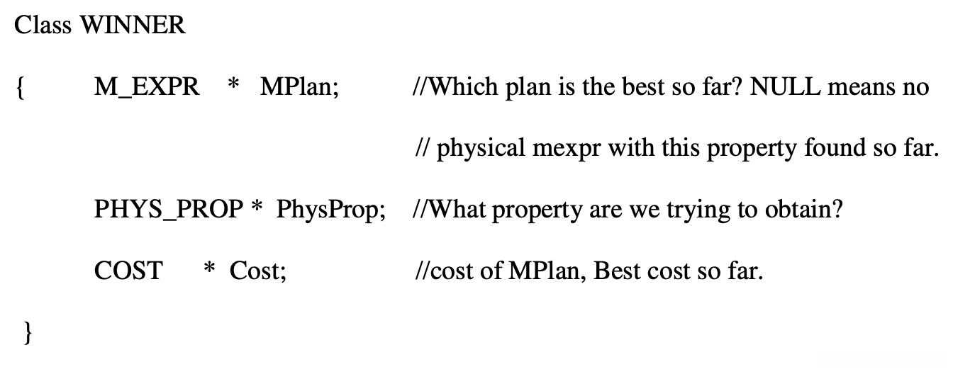 该任务将基于给定的一个context识别该组中代价最低的计划,并将其连同context一并存入该组所属的winner数据结构中。