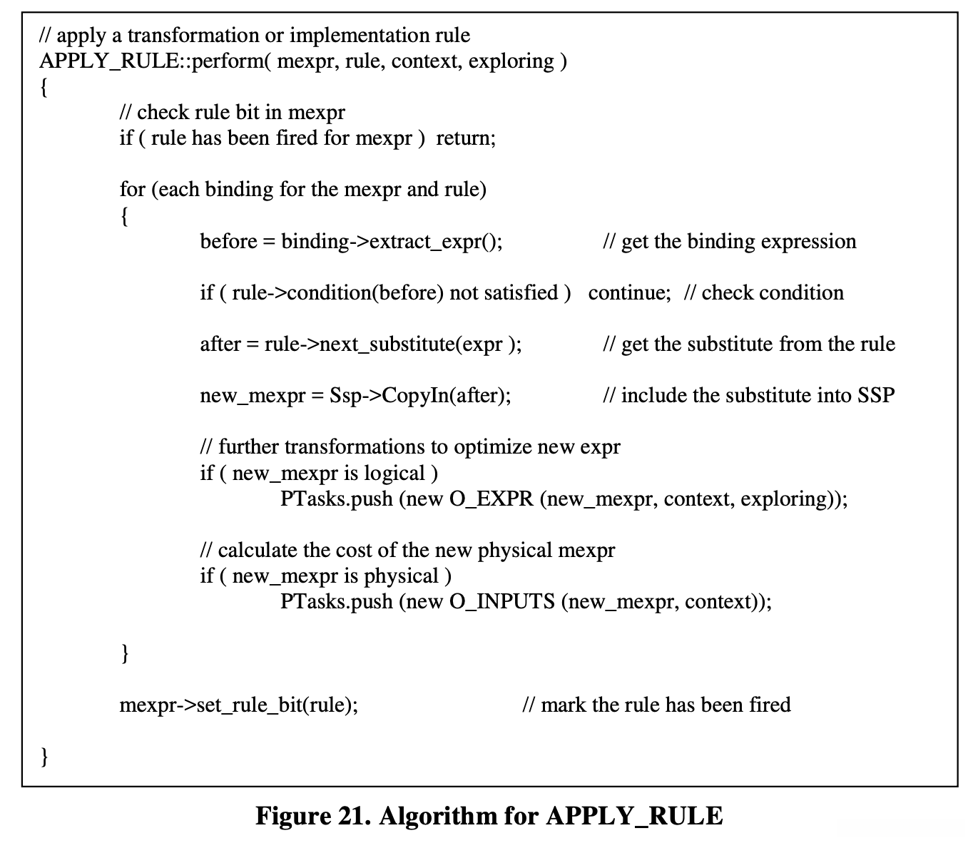 Columbia与Cascades中的apply rule算法具有相同特性。每个规则仅作用于single logical expressions上。该任务负责将单个规则应用于single logical multi-expression,并在搜索空间中生成新的logical或physical multi-expressions的任务。当给定一个rule及一个logical multi-expression时,在搜索空间中可使用的所有expressions都会被该任务确定为所有合理pattern bindings的基础上应用该rule,并在搜索空间中新增相应的substituted expressions。若新生成的multi-expressions为logical类型,则会在后续变换中被优化;若是物理型multi-expression,则会计算其计算成本。