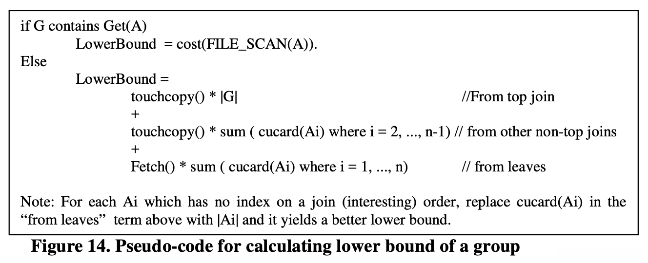 在Columbia系统中存在一个与每个组相关的下界值(Group Lower Bound),该下界值代表了从该组的所有表中提取所有元组所需付出的成本之和。这个Group Lower Bound通常会在进行表达式优化之前就已经计算完毕,并被存储于相应的数据结构中(因为其仅依赖于Group的基本逻辑属性)。特别地,在系统中的Line(4)段落特别关注那些无法通过现有策略获得最优解的目标状态(即required properties无最优计划的情况)所对应的Group下界值(Group Lower Bound),这一特殊关注使得Expr cost的整体下界得以显著提升,并进一步增强了Group剪枝策略的有效性。