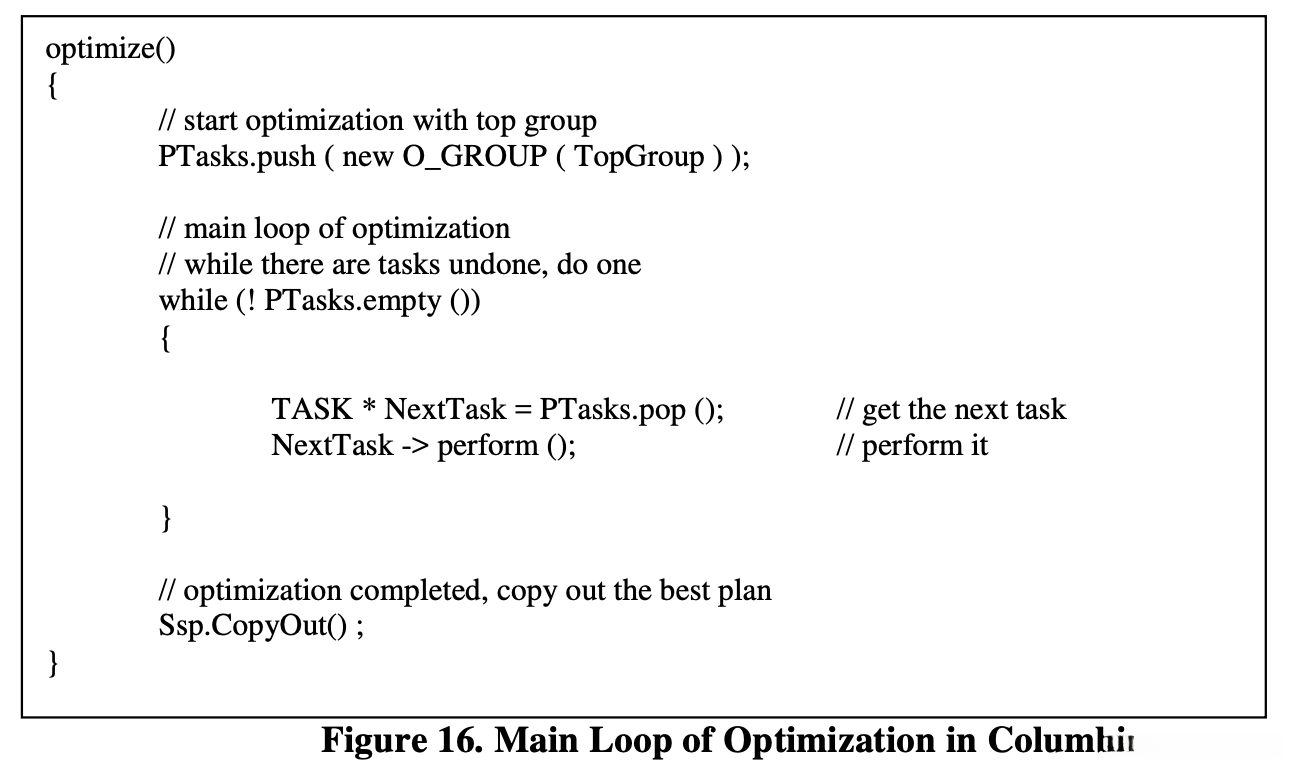 任务是搜索过程中的一项重要活动。原始的任务是对整个查询进行优化。这些任务之间可以相互创建并调度。当所有任务都已完成时, 优化过程也就结束了.每个 task 都与特定的上下文紧密相关, 并且有一个名为 perform() 的方法来真正执行每个 task. Task 类是一个抽象类, 具体实现的任务会继承这一抽象类, 并实现一个虚方法 perform(). PTasks 类包含一组未完成且需要调度及执行的任务. PTasks 使用栈结构来管理这些任务.包含一个名为 pop() 的方法用于将任务从栈中移除以便执行, 还有一个 push() 方法用于将新的任务推入栈中进行管理. PTAs实例是优化阶段创建的对象.在这一阶段, 原始 task 被推入 PTAs 中等待调度.当优化开始时, 这些原始 task 被 dequeued 并调度其 perform() 方法开始执行.其余需要参与优化的任务随后也会被创建并推入队列进行处理.下图展示了主过程伪代码框架.通过使用抽象类的方式, 我们能够实现代码结构上的简单清晰.