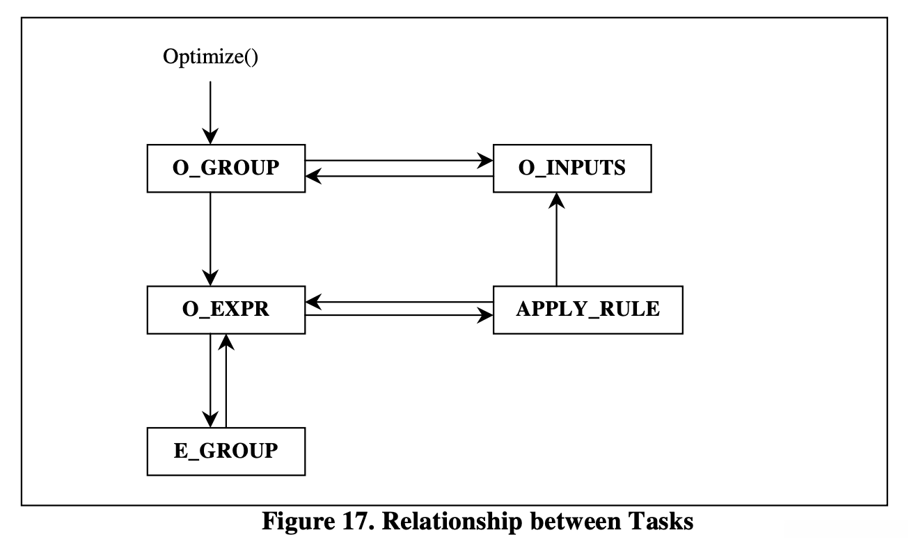 该搜索算法通过优化器中所有指定任务的执行来实现其功能。Columbia系统中的任务分为五类:组优化(O_GROUP)、组探索(E_GROUP)、表达式优化(O_EXPR)、输入优化(O_INPUTS)以及规则应用(APPLY_RULE)。 如下图所示,在系统架构中各任务之间存在特定的关系网络:箭头指示了哪些任务会触发其他任务的操作流程。本章后续部分将详细阐述Columbia系统中各个具体任务的具体实现方案,在每个方案描述过程中都会特别指出与现有系统的比较分析部分。