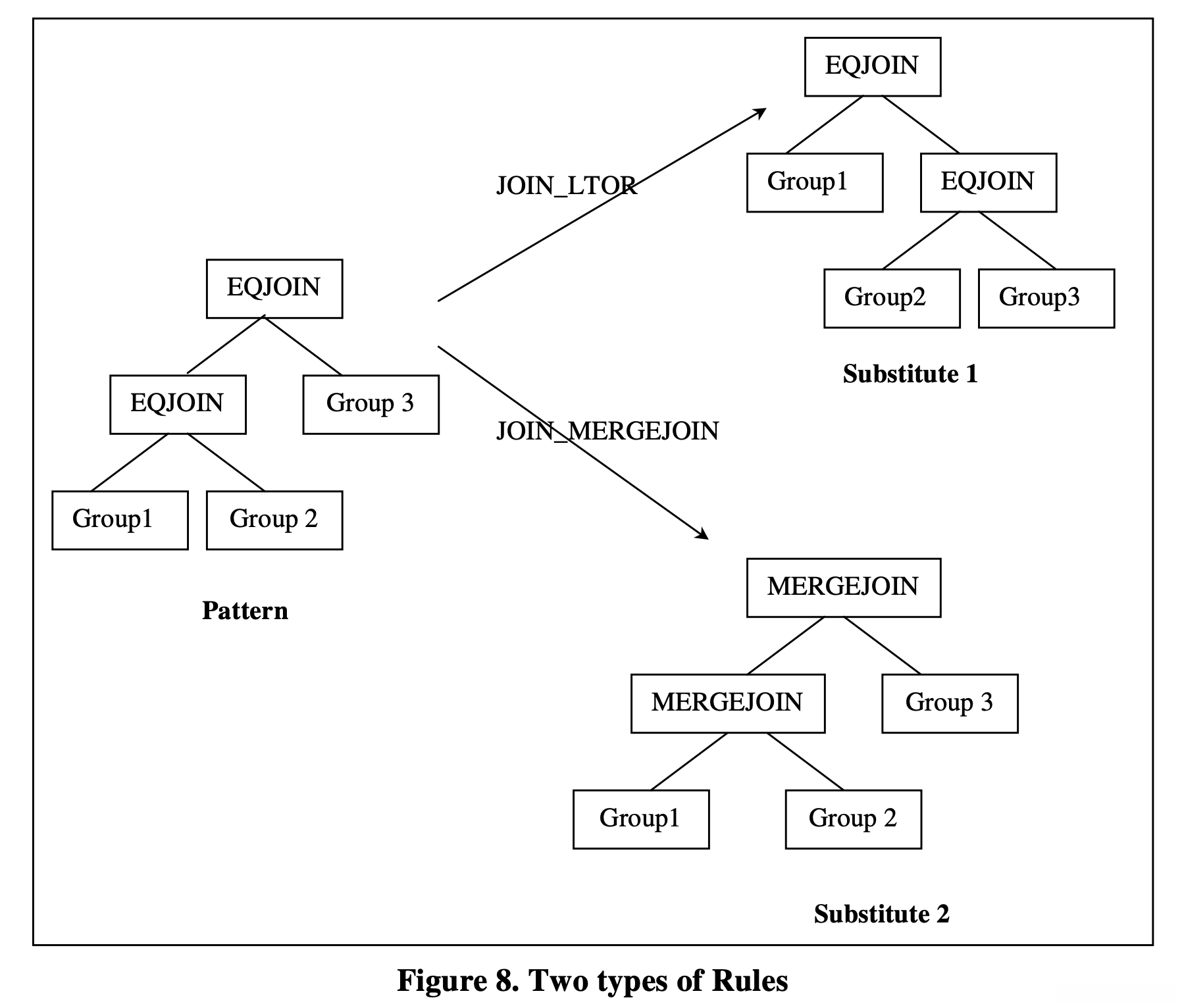 每个规则都会说明一对特定模式(pattern)与替代项(substitute)。模式用来描述可以在这种规则下发挥作用的逻辑表达式的结构;替代项则指定了在这种规则下应用后会产生什么样的结果结构。当优化器在扩展搜索空间时(注意这些规则不仅仅单独应用于单一逻辑表达式),它会遍历每一个逻辑表达式,并判断该表达式是否符合任意一条规则中的模式部分;如果某个模式匹配成功,则该规则会被触发相应的处理流程,并根据替代项部分生成新的等效逻辑表达式。