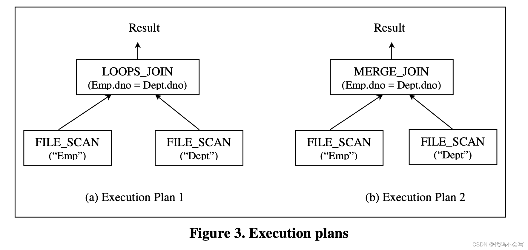 在query tree中对其中的逻辑运算符进行替换后会生成一棵物理运算符树从而形成所谓的执行计划Execution Plan或访问策略access plan. 如图3所示则展示了与图2(b)对应的两种可能的执行方案.