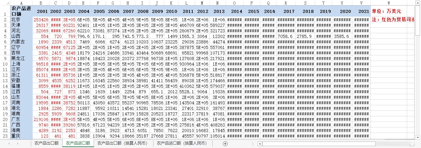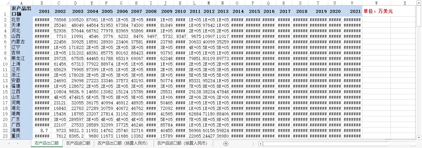 额(亿元)、农产品出口额(万美元)、农产品进口额(万美元)3、指标:年份、省份、农产品出口额(亿元...2001-2022年各省农产品进出口总额数据。1、时间:2001-2022年。、来源:商务B、农...