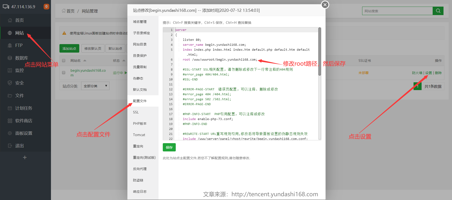 简单说下,由于站点根目录下安装包解压文件解压到“站点根目录/wordpress ”目录下了。所以站点配置文件的root需要改为: