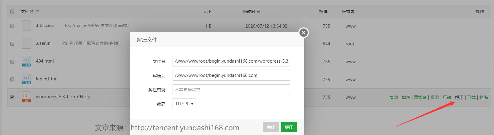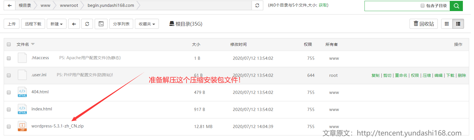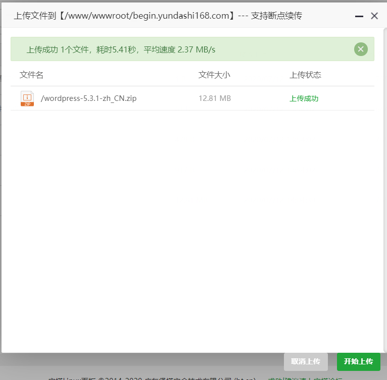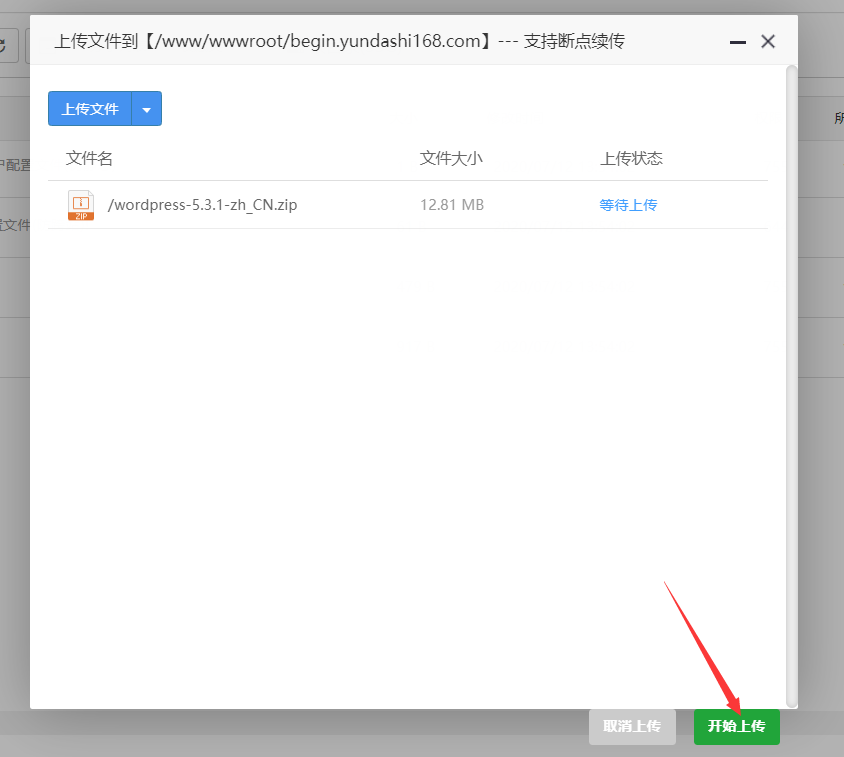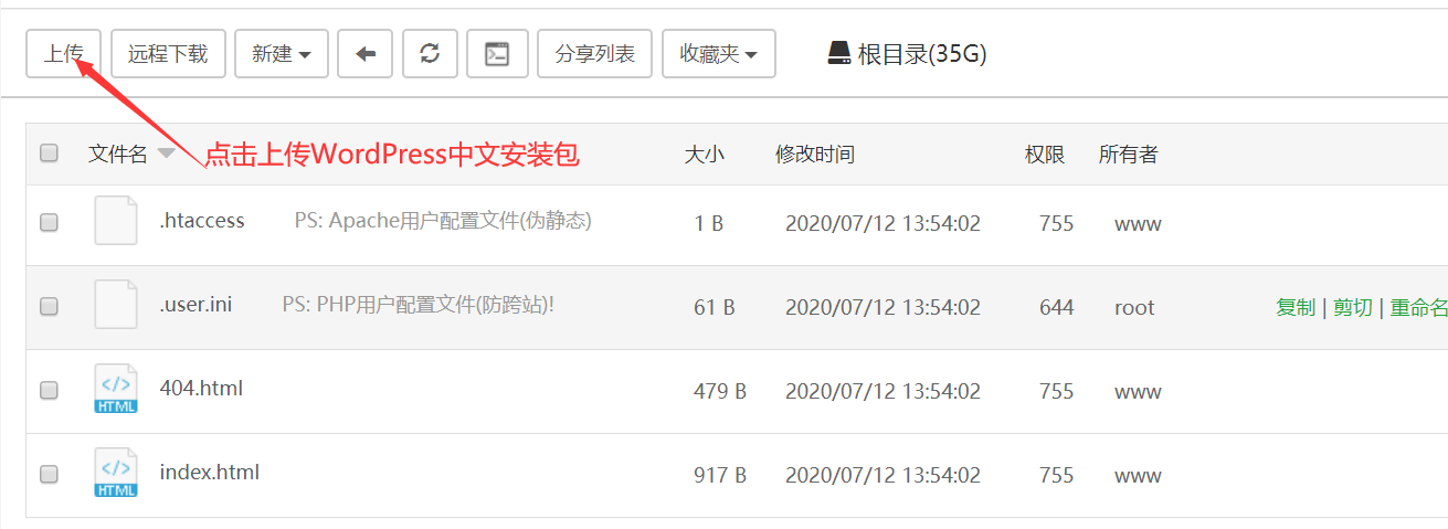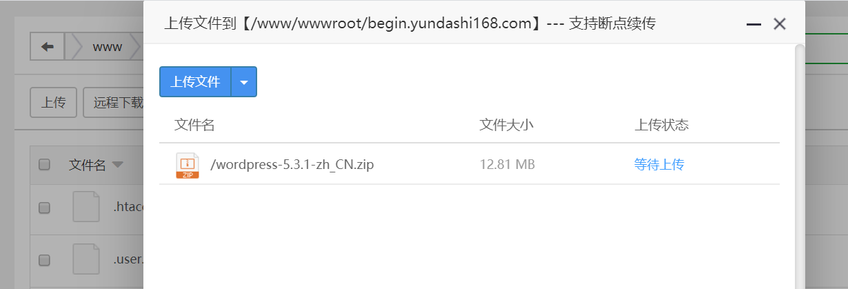 这里我是准备安装WordPress,所以是需要上传WordPress中文版安装包。