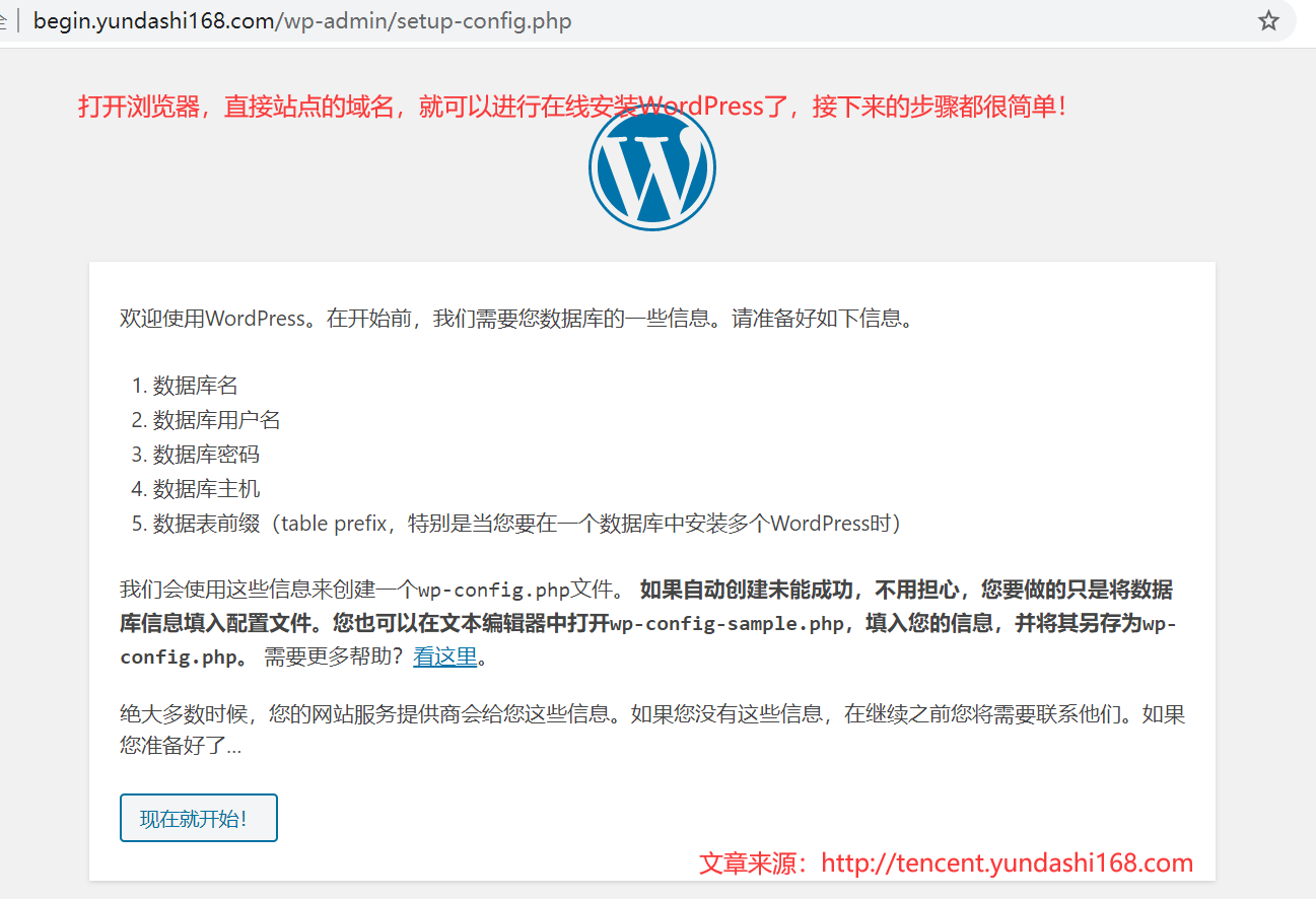 直接访问:http://begin.yundashi168.com 开始安装WordPress.