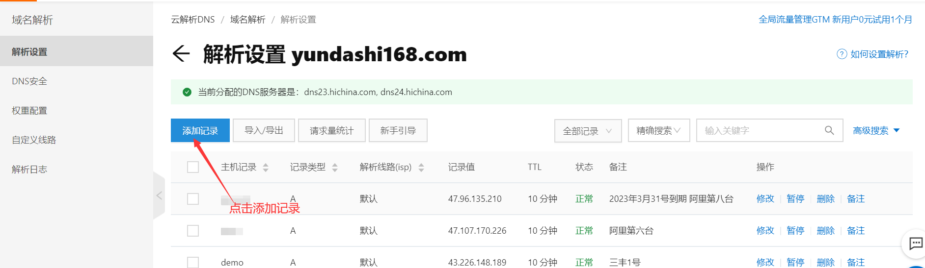 由于需要域名访问创建好的站点,所以必须进行域名解析绑定。如果你只需要IP访问的话,这一步就省略掉,但是你得修改站点Nginx的配置文件中的 server_name 属性为你的 服务器公网IP地址,而不能写域名地址了。