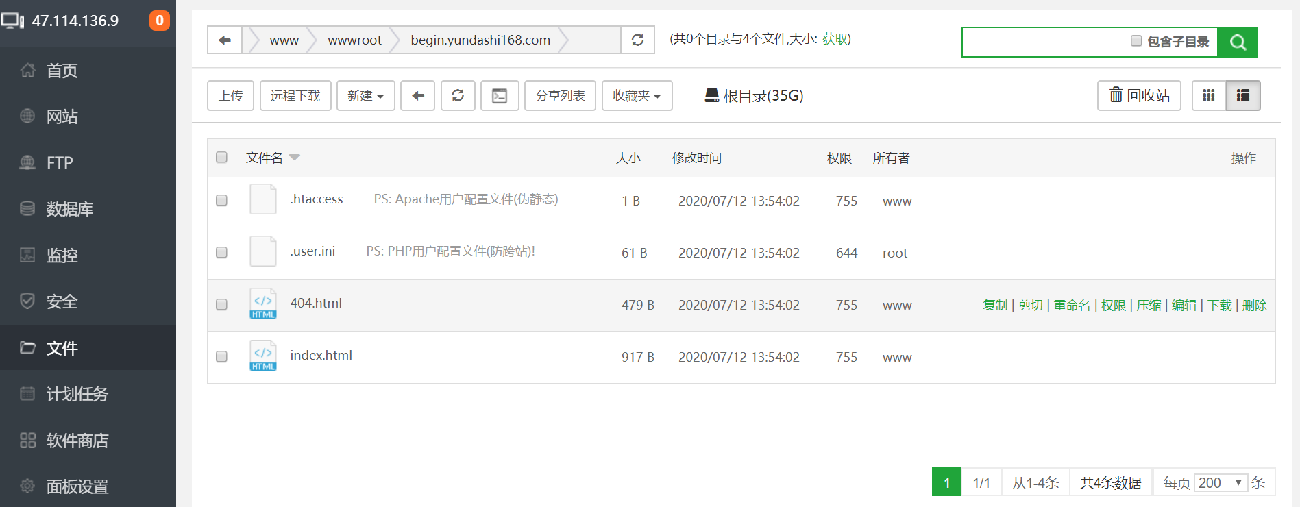 进入网站站点的根目录。后面安装任何网站程序的步骤都会在这个根目录下进行。只要新建一个站点,都会有唯一的站点根目录。站点根目录下的文件就是网站程序了。