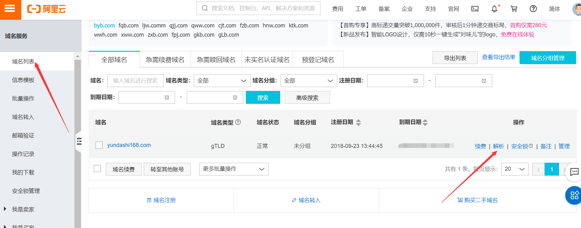 域名列表地址:https://dc.console.aliyun.com/next/index?accounttraceid=0050f9ab236f4896866130327de9264fubpf#/domain/list/all-domain