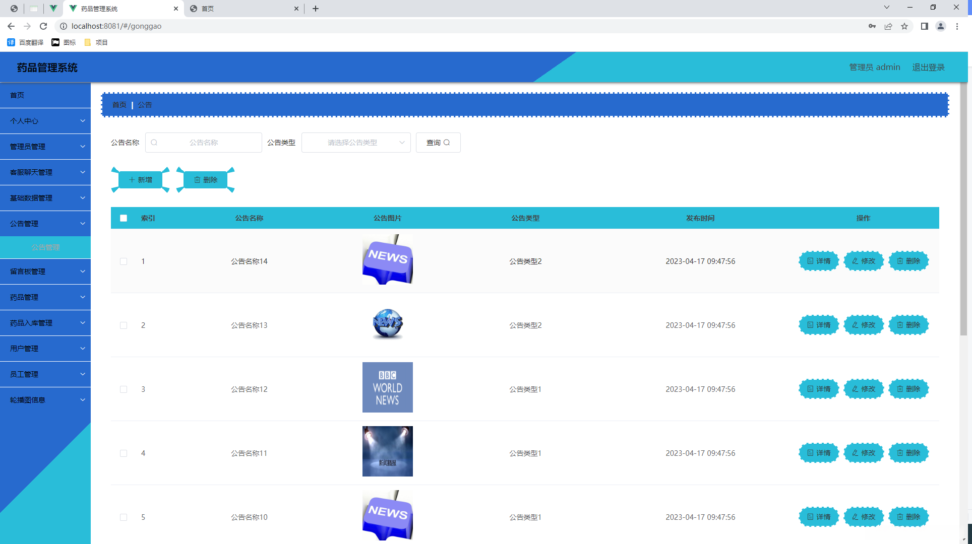 如图5.1显示的就是药品列表页面,此页面提供给管理员的功能有:查看药品、新增药品、修改药品、删除药品等。